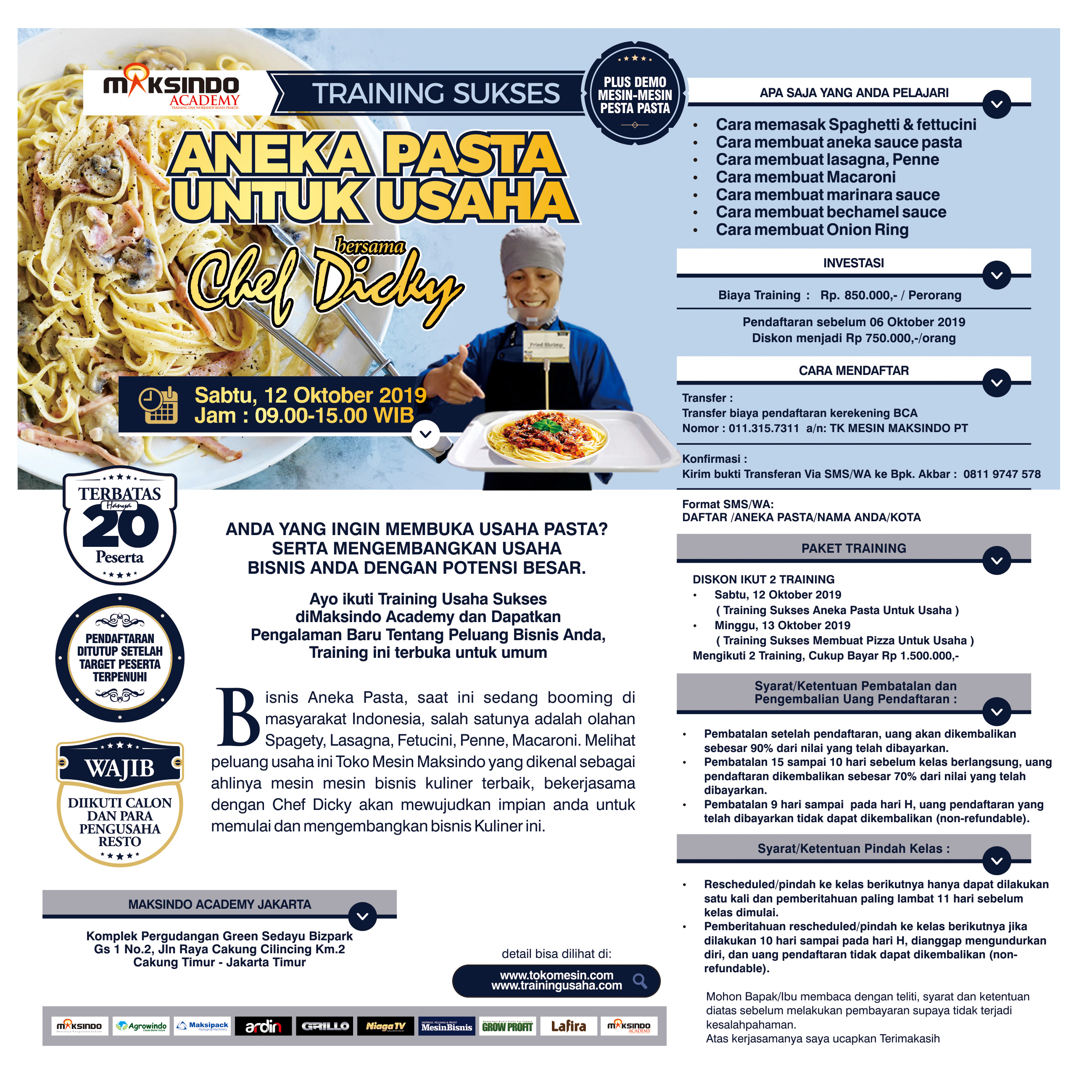 Anda yang ingin membuka Usaha Pasta? Serta mengembangkan Usaha bisnis Anda dengan potensi besar, Ayo ikuti Training Usaha Sukses di Maksindo Academy dan Dapatkan Pengalaman Baru Tentang Peluang Bisnis Anda, Training ini terbuka untuk umum Bisnis Aneka Pasta, saat ini sedang booming di masyarakat Indonesia, salah satunya adalah olahan Spagety, Lasagna, Fetucini, Penne, Macaroni.
